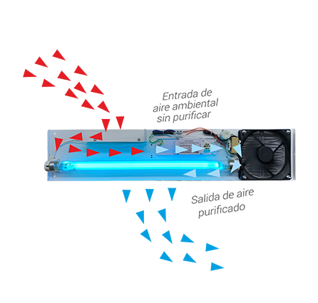 El aplique de la gama Pritec FUVC toma aire por la parte superior y lo hace pasar por todo lo largo del tubo germicida, eliminando un gran número de virus, bacterias y hongos en suspensión. El ventilador del equipo fuerza la corriente tratada a salir por la parte posterior del aparato.
